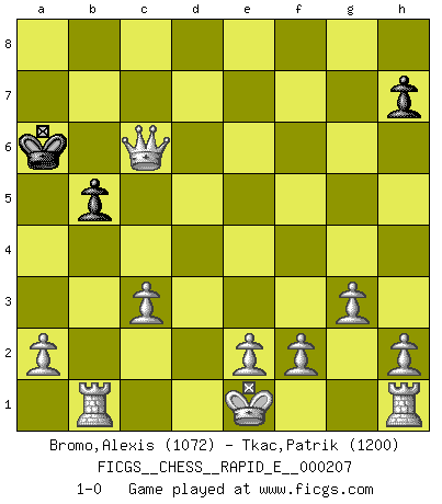 Last move : 1-0 2018 May 14 17:16:2 [Event "FICGS__CHESS__RAPID_E__000207"] [Site "FICGS"] [Date "2018.04.06"] [Round "1"] [White "Bromo,Alexis"] [Black "Tkac,Patrik"] [Result "1-0"] [WhiteElo "1072"] [BlackElo "1200"] 1.d4 Nf6 2.c4 Ne4 3.Nc3 Nxc3 4.bxc3 Nc6 5.Nf3 e6 6.Bg5 f6 7.Bh4 Ba3 8.d5 Ne5 9.Nxe5 fxe5 10.Bxd8 Kxd8 11.dxe6 Re8 12.exd7 Bxd7 13.g3 a5 14.Bh3 Re7 15.Bxd7 Rxd7 16.Qb3 Be7 17.c5 Bxc5 18.Qg8+ Ke7 19.Qxa8 Rd6 20.Qxa5 Ra6 21.Qxc5+ Rd6 22.Qxe5+ Re6 23.Qxg7+ Kd6 24.Rd1+ Kc6 25.Qd7+ Kb6 26.Qxe6+ c6 27.Rb1+ Ka6 28.Qc4+ b5 29.Qxc6+ 1-0 Queen's pawn game Player White won this chess game. Follow this game move after move (download)Bobby is the finest Chess player this country ever produced. His memory for the moves, his brilliance in dreaming up combinations, and his fierce determination to win are uncanny. (John Collins) Die westlichen Werte sind eine Sprache, welche die Putin-Administration nicht versteht. (Garry Kasparov) Sin errores no puede haber brillantez. (Emanuel Lasker) Les erreurs sont comme les malheurs, elles n'arrivent jamais seules. (Siegbert Tarrasch) Computers are like Old Testament gods; lots of rules and no mercy. (Joseph Campbell)