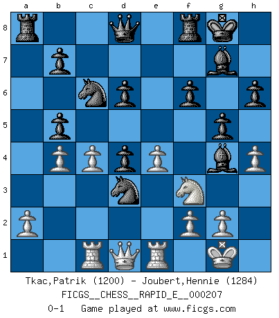 Last move : 0-1 2018 June 7 1:20:58 [Event "FICGS__CHESS__RAPID_E__000207"] [Site "FICGS"] [Date "2018.04.06"] [Round "1"] [White "Tkac,Patrik"] [Black "Joubert,Hennie"] [Result "0-1"] [WhiteElo "1200"] [BlackElo "1284"] 1.d4 Nf6 2.c4 g6 3.Nc3 Bg7 4.Nf3 O-O 5.e4 d6 6.Bd3 e5 7.O-O Nc6 8.Bg5 exd4 9.Nb5 h6 10.Bh4 g5 11.Bg3 Nh5 12.Bxd6 cxd6 13.Rc1 a6 14.h3 axb5 15.b3 Nf4 16.h4 f6 17.Re1 Bg4 18.b4 Nxd3 0-1 This chess game has been lost on time (started : 2018.04.06 2:37:0) King's Indian defense, 3.Nc3 Kingside Castling by player Black (move 4) Kingside Castling by player White (move 7) Player Black won this chess game. Follow this game move after move (download)Strategy requires thought, tactics require observation. (Max Euwe) Wenn Schach ein enormer Dschungel ist, der seine Myriaden von Geheimnissen nicht preisgeben will, dann sind Computer die Kettensägen einer gewaltigen ökologisch unsensiblen Nutzholzfirma. (Nigel Short) Si yo gano un torneo, yo lo gano por mí mismo. Yo hago las jugadas. Nadie me ayuda. (Bobby Fischer) Le profane ne songe pas à la somme de jouissance dont il se prive, qui méconnaît ce jeu aux ressources aussi variées que passionnantes. (Jean-Marie Jeanton-Lamarche) If you don't practice you don't deserve to win. (Andre Agassi)