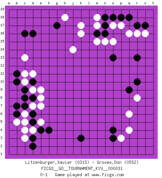 Last move : 0-1 2007 July 30 7:23:51 [Event "FICGS__GO__TOURNAMENT_KYU__000031 "] [Site "FICGS"] [Date "2007.05.02"] [Round "1"] [Black "Litzenburger,Xavier "] [White "Groves,Don "] [Result "0-1"] [Rating 1 "0315"] [Rating 2 "0552"] 1.d16 q4 2.d3 q16 3.o3 p3 4.o4 q6 5.k3 c5 6.f4 d9 7.r13 k16 8.n17 n15 9.q18 p17 10.p18 o17 11.o18 r16 12.r10 r8 13.q9 c13 14.g17 k17 15.c7 d7 16.d6 c6 17.d8 e7 18.c9 e8 19.c8 c10 20.d10 e9 21.b10 c11 22.b11 d11 23.b6 b5 24.b7 c3 25.d5 d4 26.e4 c4 27.d2 e5 28.s17 s16 29.m16 j14 30.c16 m15 31.o13 m18 32.n18 m17 33.n16 o15 34.r17 h18 0-1 This go game has been lost on time (started : 2007.05.02 0:45:32) Here are the names of the openings (joseki) played in the four corners : Corner q4 : q4 o3Hoshi (Hwajeom, Seongjeom, Xingwei`) 4-4 Point. The star or hoshi (4-4) point, emphasizing influence at the potential expense of territory.Ikken Kakari (Hankan Keolch'im, Yi Gua`jiao~, 1-Space Low Approach). Black 2 is the standard approach move to the 4-4. Corner d4 : d3 c5Komoku (Somok, Xiao~mu`) 3-4 Point. The komoku (3-4) point is the traditional corner enclosure move..Ikken Kakari (Hankan Keolch'im, Yi Gua`jiao~, 1-Space Low Pincer). The small knight move is the basic approach move to the 3-4 point stone. It has been continually used for over four centuries. There are limitless variations, with new moves constantly being discovered. White 2 opens the door to a treaure store of joseki. Corner q16 : q16 r13Hoshi (Hwajeom, Seongjeom, Xingwei`) 4-4 Point. The star or hoshi (4-4) point, emphasizing influence at the potential expense of territory.Nikken Kakari (Dukan Keolch'im, E`r Gua`jiao~, 2-Space Low Approach). White typically answers by 7-3 or 3-5 (which is not joseki). Corner d16 : d16 c13Hoshi (Hwajeom, Seongjeom, Xingwei`) 4-4 Point. The star or hoshi (4-4) point, emphasizing influence at the potential expense of territory.Nikken Kakari (Dukan Keolch'im, E`r Gua`jiao~, 2-Space Low Approach). Black typically answers by 7-3 or 3-5 (which is not joseki). Player White won this Go (weiqi, baduk) game.Follow this game move after move (download ) The rectangular six is normally alive. (Anonymous) Fame, I have already. Now I need the money. (an elderly Steinitz)