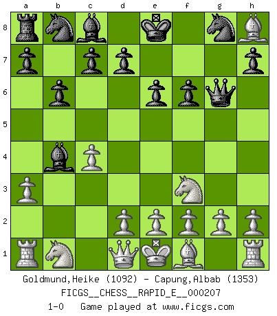 Last move : 1-0 2018 May 15 23:24:42 [Event "FICGS__CHESS__RAPID_E__000207"] [Site "FICGS"] [Date "2018.04.06"] [Round "1"] [White "Goldmund,Heike"] [Black "Capung,Albab"] [Result "1-0"] [WhiteElo "1092"] [BlackElo "1353"] 1.b4 e6 2.Bb2 Bxb4 3.Bxg7 Qg5 4.Bxh8 f6 5.Nf3 Qg6 6.c4 b6 7.a3 1-0 This chess game has been lost on time (started : 2018.04.06 2:37:0) Polish (Sokolsky) opening Player White won this chess game. Follow this game move after move (download)When you play Bobby, it is not a question if you win or lose. It is a question if you survive. (Boris Spassky) Es gibt zwei Arten von Opfern: Korrekte und meine. (Mikhail Nekhemyevich Tal) Sin errores no puede haber brillantez. (Emanuel Lasker) Mais l'homme est une créature légère et illogique : semblable au joueur d'échecs, il n'aime que le processus du but à atteindre, non le but lui-même. (Dostoïevsky) Luck never gives; it only lends. (Swedish proverb)