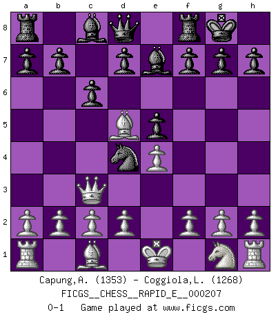 Last move : 0-1 2018 May 15 11:23:39 [Event "FICGS__CHESS__RAPID_E__000207"] [Site "FICGS"] [Date "2018.04.06"] [Round "1"] [White "Capung,Albab"] [Black "Coggiola,Leandro Damian"] [Result "0-1"] [WhiteElo "1353"] [BlackElo "1268"] 1.e3 e5 2.Qf3 Nf6 3.Nc3 Be7 4.Bc4 O-O 5.e4 Nc6 6.Nd5 Nxd5 7.Bxd5 Nd4 8.Qc3 c6 0-1 This chess game has been lost on time (started : 2018.04.06 2:37:0) Van't Kruijs Opening Kingside Castling by player Black (move 4) Player Black won this chess game. Follow this game move after move (download)Not all artists are Chess players, but all Chess players are artists. (Marcel Duchamp) Ich rechne überhaupt nicht voraus. Ich gewinne auch so. (Robert James Fischer) Las ideas audaces son como las piezas del Ajedrez que avanzan hacia adelante. Ellas pueden ser vencidas, pero también pueden iniciar una partida victoriosa. (Goethe) Aucun coup ne doit être joué sans but. (Pedro Damiano) The beginning is the most important part of the work. (Plato)