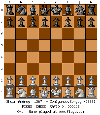 Last move : 0-1 2018 May 6 10:40:8 [Event "FICGS__CHESS__RAPID_D__000113"] [Site "FICGS"] [Date "2018.04.06"] [Round "1"] [White "Shein,Andrey"] [Black "Zemlyanov,Sergey"] [Result "0-1"] [WhiteElo "1367"] [BlackElo "1356"] 0-1 This chess game has been lost on time (started : 2018.04.06 4:59:0) Player Black won this chess game. Follow this game move after move (download)Chess is ruthless: you've got to be prepared to kill people. (Nigel Short) Der beste Spieler in einem Turnier gewinnt es nie. Er landet auf Platz zwei oder drei. (Siegbert Tarrasch) Una mala movida nulifica cuarenta buenas. (Horowitz) Vous m'avez demandé de vous exposer quel est le fondement de la prière. Je ne fais que préparer les pièces du jeu sur la table... Nous sera-t-il permis d'en adopter les règles et si nous les appliquons scrupuleusement nous ne tarderons pas à faire mat le Roi divin ! Il ne pourra échapper à nos mains. (Sainte Thérèse d'Avila, Chemin de perfection) Begin at the beginning and go on till you come to the end; then stop. (Lewis Carrol, Alice in Wonderland)