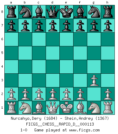 Last move : 1-0 2018 May 6 10:40:8 [Event "FICGS__CHESS__RAPID_D__000113"] [Site "FICGS"] [Date "2018.04.06"] [Round "1"] [White "Nurcahyo,Dery"] [Black "Shein,Andrey"] [Result "1-0"] [WhiteElo "1684"] [BlackElo "1367"] 1.g3 1-0 This chess game has been lost on time (started : 2018.04.06 4:59:0) Benko's Opening Player White won this chess game. Follow this game move after move (download)The beauty of a move lies not in its' appearance but in the thought behind it. (Siegbert Tarrasch) Auf jeden Fall musst du zuerst Rechtsanwalt werden, damit du deine eigenen Interessen und die deiner Familie vertreten kannst. [Brief an seinen Sohn] (José Raúl Capablanca) Si no le temes a Spassky, entonces elimino el elemento del dinero. (Jim Slater) Seul un grand joueur sait à quel point il joue faiblement. (Xavier Tartacover) It is not titles that honor men, but men that honor titles. (Niccolo Machiavelli)