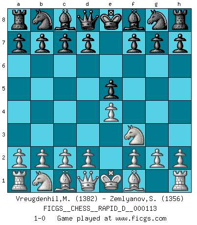 Last move : 1-0 2018 May 18 11:34:23 [Event "FICGS__CHESS__RAPID_D__000113"] [Site "FICGS"] [Date "2018.04.06"] [Round "1"] [White "Vreugdenhil,Maarten"] [Black "Zemlyanov,Sergey"] [Result "1-0"] [WhiteElo "1382"] [BlackElo "1356"] 1.e4 e5 2.Nf3 1-0 This chess game has been lost on time (started : 2018.04.06 4:59:0) King's knight Opening Player White won this chess game. Follow this game move after move (download)Chess is really ninety nine percent calculation. (Soltis) Kasparov ist eine Art Monster mit hundert Augen, denen auch nicht das Geringste entgeht. (Tony Miles) Cuando la partida de Ajedrez termina, el Peón y el Rey regresan a la misma caja. (Irish saying) Le système Elo représente seulement une moyenne. Il est simplement un indicateur de votre stabilité. (Anatoli Karpov) Perhaps chess is the wrong game for the times (The Chess Master and the Computer, by Garry Kasparov - 2010)