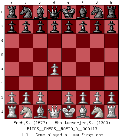 Last move : 1-0 2018 May 10 10:58:18 [Event "FICGS__CHESS__RAPID_D__000113"] [Site "FICGS"] [Date "2018.04.06"] [Round "1"] [White "Pech,Stepan"] [Black "Bhattacharjee,Somnath"] [Result "1-0"] [WhiteElo "1672"] [BlackElo "1300"] 1.d4 1-0 This chess game has been lost on time (started : 2018.04.06 4:59:0) Queen's pawn Player White won this chess game. Follow this game move after move (download)It is difficult to play against Einstein's theory --on his first loss to Fischer. (Mikhail Tal) Es ist nicht das erste mal, dass sich die FIDE dem Arabischen Geld gebeugt hat (über die FIDE WM 2004 in Lybien). (Larry Evans) Te sientas frente a un tablero y repentinamente tu corazón brinca. Tu mano tiembla al tomar una pieza y moverla. Pero lo que el Ajedrez te enseña es que tu debes permanecer ahí con calma y pensar de que si realmente es una buena idea o de que si hay otras ideas mejores. (Stanley Kubrick) Ce n'est pas pour s'amuser qu'il joue aux échecs : il célèbre un culte. (Vladimir Nabokov) At last I discovered the true beauty of chess. So I proposed to her. (Dinesh De Silva)