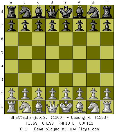 Last move : 0-1 2018 May 6 10:40:8 [Event "FICGS__CHESS__RAPID_D__000113"] [Site "FICGS"] [Date "2018.04.06"] [Round "1"] [White "Bhattacharjee,Somnath"] [Black "Capung,Albab"] [Result "0-1"] [WhiteElo "1300"] [BlackElo "1353"] 0-1 This chess game has been lost on time (started : 2018.04.06 4:59:0) Player Black won this chess game. Follow this game move after move (download)Of Chess it has been said that life is not long enough for it, but that is the fault of life, not Chess. (William Ewart Napier) Im Schach gewinnt jeder. Hat man Freunde am Spiel - und das ist die Hauptsache - ist auch der Verlust einer Partie kein Unglück. (David Bronstein) Mis oponentes también hacen buenas movidas. A veces yo no tomo esas cosas en consideración. (Bobby Fischer) Votre prénom est 'Tactique', votre deuxième prénom est 'Tactique' et votre nom est 'Tactique'. (Ken Smith) Art disturbs, science reassures. (Georges Braque, Le Jour et la Nuit)