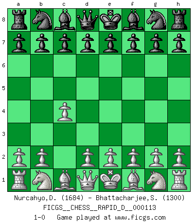 Last move : 1-0 2018 May 6 10:40:8 [Event "FICGS__CHESS__RAPID_D__000113"] [Site "FICGS"] [Date "2018.04.06"] [Round "1"] [White "Nurcahyo,Dery"] [Black "Bhattacharjee,Somnath"] [Result "1-0"] [WhiteElo "1684"] [BlackElo "1300"] 1.c4 1-0 This chess game has been lost on time (started : 2018.04.06 4:59:0) English Opening Player White won this chess game. Follow this game move after move (download)He who takes the Queen's Knight's Pawn will sleep in the streets. (Anonymous) Du weisst es gibt ein Problem mit Computern und Fernschach, wenn jeder eine Rating von 2450 hat. (John Christen Knudsen) El Ajedrez no es como la vida... ¡tiene reglas!. (Mark Pasternak) Si le désir cupide (et stupide) de gagner est une inépuisable source de souffrance, une combinaison brillante sur l'échiquier est une découverte : le coquelicot qui s'épanouit lorsque apparaît la Voie Lactée. (Arrabal) The various flowers seem good to different people. (Chinese proverb)