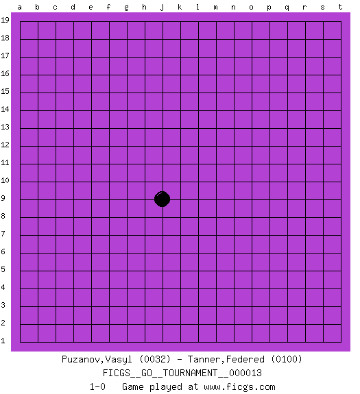 Last move : 1-0 2018 May 7 10:42:41 [Event "FICGS__GO__TOURNAMENT__000013"] [Site "FICGS"] [Date "2018.04.07"] [Round "1"] [Black "Puzanov,Vasyl"] [White "Tanner,Federed"] [Result "1-0"] [Rating 1 "0032"] [Rating 2 "0100"] 1.j9 1-0 This go game has been lost on time (started : 2018.04.07 2:11:40) Here are the names of the openings (joseki) played in the four corners : Corner d4 : j9 1-0 This joseki is unknown. A weak or weird move has probably been played in this corner. Player Black won this Go (weiqi, baduk) game. Follow this game move after move (download)The monkey jump is worth eight points. (Anonymous) Faith : not wanting to know what is true. (Friedrich Nietzsche)