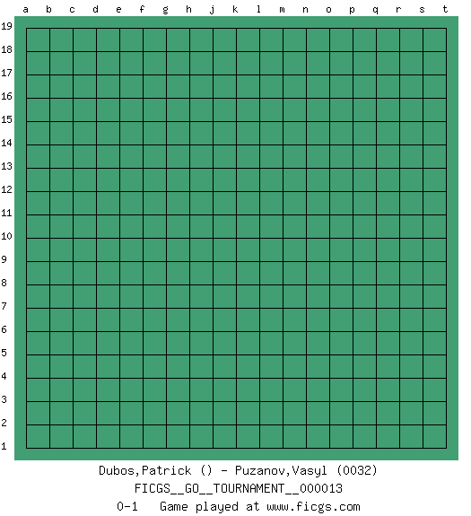 Last move : 0-1 2018 May 7 10:42:41 [Event "FICGS__GO__TOURNAMENT__000013"] [Site "FICGS"] [Date "2018.04.07"] [Round "1"] [Black "Dubos,Patrick"] [White "Puzanov,Vasyl"] [Result "0-1"] [Rating 2 "0032"] 0-1 This go game has been lost on time (started : 2018.04.07 2:11:40) Here are the names of the openings (joseki) played in the four corners : Player White won this Go (weiqi, baduk) game. Follow this game move after move (download)In the corner, five stones in a row on the third line are alive. (Anonymous) When you stop learning you start dying. (M. Scott Adams)