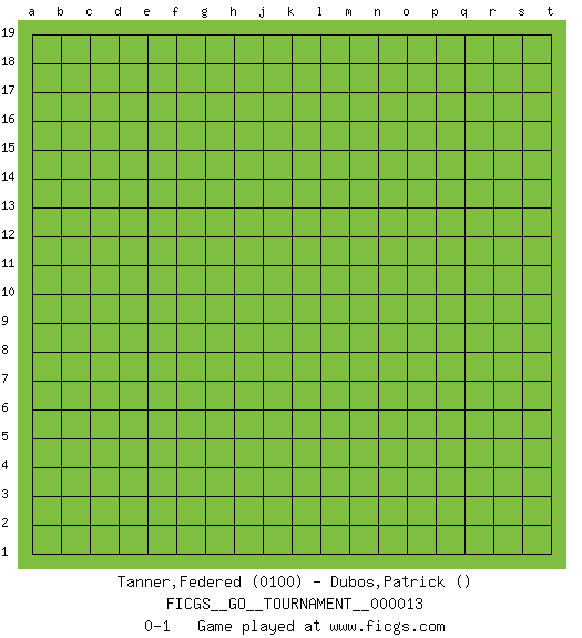 Last move : 0-1 2018 May 7 10:42:41 [Event "FICGS__GO__TOURNAMENT__000013"] [Site "FICGS"] [Date "2018.04.07"] [Round "1"] [Black "Tanner,Federed"] [White "Dubos,Patrick"] [Result "0-1"] [Rating 1 "0100"] 0-1 This go game has been lost on time (started : 2018.04.07 2:11:40) Here are the names of the openings (joseki) played in the four corners : Player White won this Go (weiqi, baduk) game. Follow this game move after move (download)Don't make dango's. (Anonymous) Every now and then a man's mind is stretched by a new idea and never shrinks back to its former dimensions. (Oliver Wendell Holmes, Sr.)