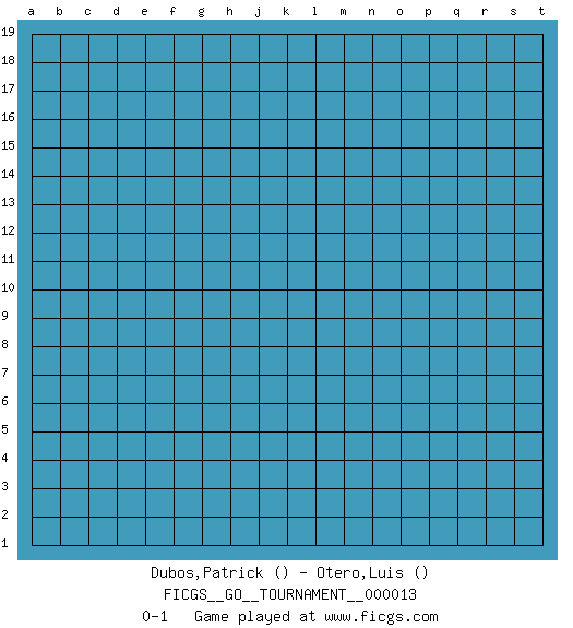 Last move : 0-1 2018 May 7 10:42:41 [Event "FICGS__GO__TOURNAMENT__000013"] [Site "FICGS"] [Date "2018.04.07"] [Round "1"] [Black "Dubos,Patrick"] [White "Otero,Luis"] [Result "0-1"] 0-1 This go game has been lost on time (started : 2018.04.07 2:11:40) Here are the names of the openings (joseki) played in the four corners : Player White won this Go (weiqi, baduk) game. Follow this game move after move (download)When you study joseki, you lose two stones in strength. (Anonymous) A belief is an idea the mind possesses, an idea that possesses the mind. (Robert Oxden Bolton)