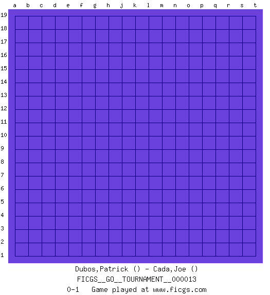 Last move : 0-1 2018 May 7 10:42:41 [Event "FICGS__GO__TOURNAMENT__000013"] [Site "FICGS"] [Date "2018.04.07"] [Round "1"] [Black "Dubos,Patrick"] [White "Cada,Joe"] [Result "0-1"] 0-1 This go game has been lost on time (started : 2018.04.07 2:11:40) Here are the names of the openings (joseki) played in the four corners : Player White won this Go (weiqi, baduk) game. Follow this game move after move (download)If you cannot succeed, then die gloriously. (Chinese proverb) The weakness of an artist is dogma. (Josh Waitzkin)