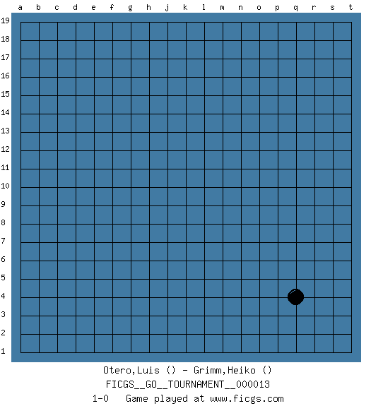 Last move : 1-0 2018 May 7 22:43:4 [Event "FICGS__GO__TOURNAMENT__000013"] [Site "FICGS"] [Date "2018.04.07"] [Round "1"] [Black "Otero,Luis"] [White "Grimm,Heiko"] [Result "1-0"] 1.q4 1-0 This go game has been lost on time (started : 2018.04.07 2:11:40) Here are the names of the openings (joseki) played in the four corners : Corner q4 : q4 1-0 Hoshi (Hwajeom, Seongjeom, Xingwei`) 4-4 Point. The star or hoshi (4-4) point, emphasizing influence at the potential expense of territory. Player Black won this Go (weiqi, baduk) game. Follow this game move after move (download)Don't get surrounded ! Ever ! (Anonymous) Establishing goals is all right if you don't let them deprive you of interesting detours. (Doug Larson)