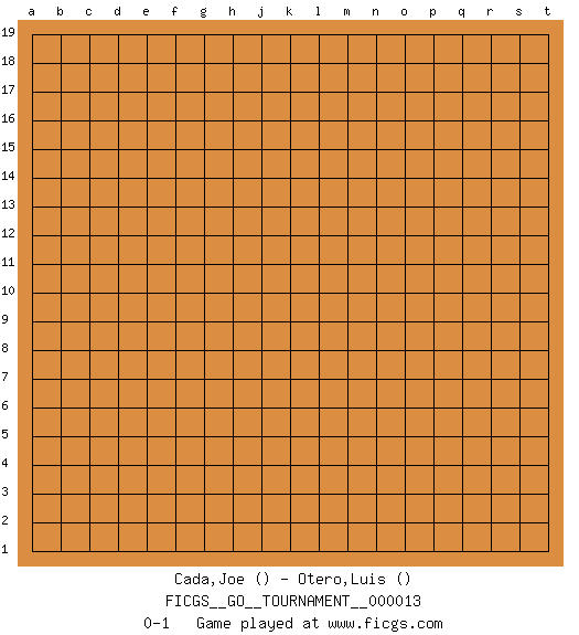 Last move : 0-1 2018 May 7 10:42:41 [Event "FICGS__GO__TOURNAMENT__000013"] [Site "FICGS"] [Date "2018.04.07"] [Round "1"] [Black "Cada,Joe"] [White "Otero,Luis"] [Result "0-1"] 0-1 This go game has been lost on time (started : 2018.04.07 2:11:40) Here are the names of the openings (joseki) played in the four corners : Player White won this Go (weiqi, baduk) game. Follow this game move after move (download)Good moves and bad moves are bedfellows. (Anonymous) It's only after you lost everything, Tyler says, that you're free to do anything. (Chuck Palahniuk, Fight Club)
