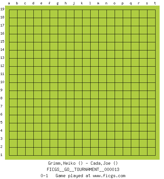 Last move : 0-1 2018 May 7 10:42:41 [Event "FICGS__GO__TOURNAMENT__000013"] [Site "FICGS"] [Date "2018.04.07"] [Round "1"] [Black "Grimm,Heiko"] [White "Cada,Joe"] [Result "0-1"] 0-1 This go game has been lost on time (started : 2018.04.07 2:11:40) Here are the names of the openings (joseki) played in the four corners : Player White won this Go (weiqi, baduk) game. Follow this game move after move (download)Territory really exists only in the end. (Pierre Audouard) The leaves of memory seemed to make a mournful rustling in the dark. (Henry Wadsworth Longfellow)