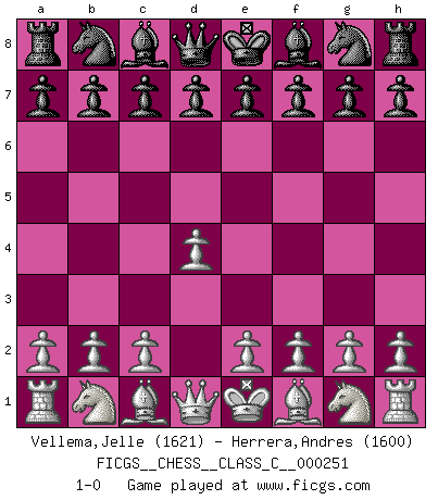 Last move : 1-0 2018 May 17 23:32:52 [Event "FICGS__CHESS__CLASS_C__000251"] [Site "FICGS"] [Date "2018.04.07"] [Round "1"] [White "Vellema,Jelle"] [Black "Herrera,Andres"] [Result "1-0"] [WhiteElo "1621"] [BlackElo "1600"] 1.d4 1-0 This chess game has been lost on time (started : 2018.04.07 10:21:20) Queen's pawn Player White won this chess game. Follow this game move after move (download)Castle early and often. (Rob Sillars) Ich bewundere Kasparows phantasievolle Angriffssiege aus den Achtzigern und Neunzigern, aber wenn man sie mit dem Computer überprüft, nimmt der Computer in jeder zweiten Partie die Opfer an, verteidigt sich und gewinnt. (Vladimir Kramnik) Ciertamente, de todas la drogas del mundo, el Ajedrez debe ser el mas placentero permamentemente. (Assiac) Un journaliste : 'Vous préférez avoir une dame de plus sur l'échiquier ou au lit ?' Boris Spassky : 'Ca dépend de la position.' Animated gif is worth one mega-word. (Unknown)