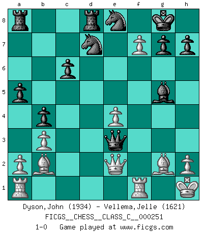 Last move : 1-0 2018 August 6 22:3:49 [Event "FICGS__CHESS__CLASS_C__000251"] [Site "FICGS"] [Date "2018.04.07"] [Round "1"] [White "Dyson,John"] [Black "Vellema,Jelle"] [Result "1-0"] [WhiteElo "1934"] [BlackElo "1621"] 1.Nf3 Nf6 2.c4 e6 3.Nc3 d5 4.d4 c6 5.g3 Be7 6.Bg2 O-O 7.O-O b6 8.Ne5 Bb7 9.e4 dxc4 10.Nxc4 Ba6 11.b3 b5 12.Ne3 b4 13.Ne2 Bxe2 14.Qxe2 Qxd4 15.Bb2 Qb6 16.Kh1 Nbd7 17.g4 Rfd8 18.g5 Ne8 19.f4 a5 20.f5 Bxg5 21.fxe6 Qxe3 22.exf7+ 1-0 Reti Opening Kingside Castling by player Black (move 6) Kingside Castling by player White (move 7) Player White won this chess game. Follow this game move after move (download)With or without the title, Bobby Fischer was unquestionably the greatest player of his time. (Burt Hochberg) Ich kenne Menschen, die allen Willen der Welt besitzen und doch nicht Schach spielen können. (Robert James Fischer) ¿Esta Bobby Fischer algo cuerdo?. (Salo Flohr) Toutes les manuvres exécutées sur une colonne ouverte ont pour but ultime l'intrusion définitive sur la septième ou la huitième rangée, en plein cur de la position ennemie. (Aaron Nimzovitch) Rules and bones are meant to be broken. (Anonymous)