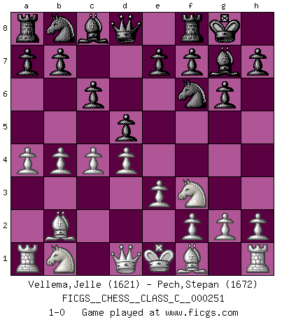 Last move : 1-0 2018 August 10 0:16:51 [Event "FICGS__CHESS__CLASS_C__000251"] [Site "FICGS"] [Date "2018.04.07"] [Round "1"] [White "Vellema,Jelle"] [Black "Pech,Stepan"] [Result "1-0"] [WhiteElo "1621"] [BlackElo "1672"] 1.d4 Nf6 2.Nf3 g6 3.e3 d5 4.b4 Bg7 5.Bb2 O-O 6.c4 c6 7.a4 1-0 This chess game has been lost on time (started : 2018.04.07 10:21:20) King's Indian : East Indian defense Kingside Castling by player Black (move 5) Player White won this chess game. Follow this game move after move (download)Personally, I rather look forward to a computer program winning the world Chess Championship. Humanity needs a lesson in humility. (Richard Dawkings) Wenn Du nicht kämpfst, um anderen etwas zu beweisen, sondern nur für Dich selbst, dann bist du fast unbesiegbar. (Garry Kasparov) Para mi, el Ajedrez es la vida y cada partida es como una nueva vida. Todo jugador de Ajedrez suele vivir muchas vidas durante su vida. (Eduard Gufeld) Même un GMI sait rarement calculer sur plus de cinq coups une attaque à sacrifices. (Rudolf Spielmann) Luck is when opportunity knocks and you answer. (Anonymous)