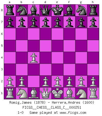 Last move : 1-0 2018 May 17 23:32:52 [Event "FICGS__CHESS__CLASS_C__000251"] [Site "FICGS"] [Date "2018.04.07"] [Round "1"] [White "Romig,James"] [Black "Herrera,Andres"] [Result "1-0"] [WhiteElo "1878"] [BlackElo "1600"] 1.c4 1-0 This chess game has been lost on time (started : 2018.04.07 10:21:20) English Opening Player White won this chess game. Follow this game move after move (download)The hallmark of the artist is simplicity. (Larry Evans) Mein erstes Ziel war nicht, die Partie zu gewinnen, sondern eine Figur zu opfern. -- der junge (Wilhelm Steinitz) El juego del Ajedrez no es solamente una diversión quieta; algunas cualidades muy valuables de la mente se pueden adquirir y cultivar con el, como convertirlos en habitos disponibles para toda ocasión; ya que la vida es algo así como el Ajedrez. (Benjamin Franklin) Les échecs sont plus proches de l'art de l'assassinat que de l'art de la guerre. (Arturo Perez-Reverte) All men can see these tactics whereby I conquer, but what none can see is the strategy out of which victory is evolved. (Sun Tzu)