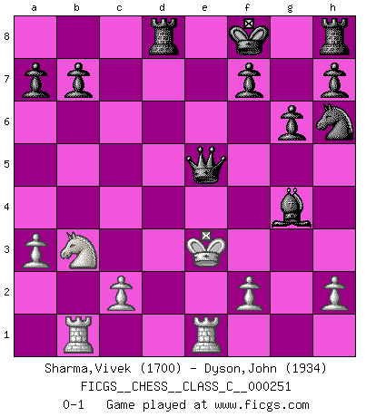 Last move : 0-1 2018 May 27 12:29:39 [Event "FICGS__CHESS__CLASS_C__000251"] [Site "FICGS"] [Date "2018.04.07"] [Round "1"] [White "Sharma,Vivek"] [Black "Dyson,John"] [Result "0-1"] [WhiteElo "1700"] [BlackElo "1934"] 1.e4 c5 2.e5 Nc6 3.Nf3 g6 4.Nc3 Bg7 5.d4 cxd4 6.Ne2 Nxe5 7.Qxd4 Nxf3+ 8.gxf3 Bxd4 9.Nxd4 e5 10.Nb5 d5 11.f4 Qe7 12.fxe5 Qb4+ 13.Nc3 d4 14.Bb5+ Kf8 15.a3 Qc5 16.Ne2 Qxb5 17.Nxd4 Qd5 18.Bh6+ Nxh6 19.O-O-O Qa2 20.Rhe1 Qa1+ 21.Kd2 Qxb2 22.Nb3 Bg4 23.Rb1 Rd8+ 24.Ke3 Qxe5+ 0-1 Sicilian defense Queenside Castling by player White (move 19) Player Black won this chess game. Follow this game move after move (download)Chess is a matter of delicate judgment, knowing when to punch and how to duck. (Bobby Fischer) Man kann eine Schachpartie nur gewinnen, wenn das Gleichgewicht gestört ist. In einer Stellung mit ungestörtem Gleichgewicht ist auch das größte Genie hilflos - in der Stellung steckt dann eben kein genialer Einfall. (Wilhelm Steinitz) La batalla por la última verdad nunca sera ganada. Y es por eso que el Ajedrez es tan fascinante. (Hans Kmoch) Les échecs sont utiles à l'exercice de la faculté de penser et à celle de l'imagination. Car nous devons posséder une méthode élaborée pour atteindre des buts partout où nous devons conduire notre raison. (Leibnitz) No enterprise is more likely to succeed than one concealed from the enemy until it is ripe for execution. (Niccolo Machiavelli)
