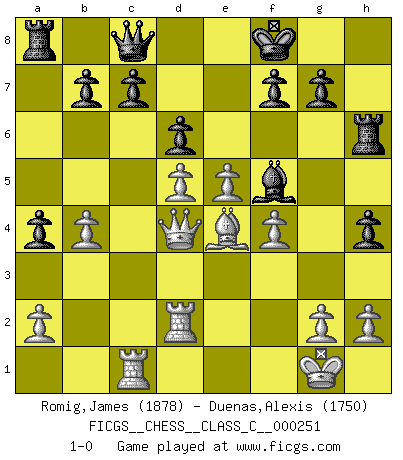 Last move : 1-0 2018 April 12 12:22:50 [Event "FICGS__CHESS__CLASS_C__000251"] [Site "FICGS"] [Date "2018.04.07"] [Round "1"] [White "Romig,James"] [Black "Duenas,Alexis"] [Result "1-0"] [WhiteElo "1878"] [BlackElo "1750"] 1.c4 e5 2.Nf3 Nc6 3.d4 exd4 4.Nxd4 Bb4+ 5.Bd2 Bxd2+ 6.Qxd2 Nxd4 7.Qxd4 Nf6 8.Qe5+ Kf8 9.Nc3 d6 10.Qd4 Bd7 11.e4 Qe7 12.Be2 Bc6 13.f3 h5 14.O-O h4 15.Nd5 Qd8 16.Rad1 a5 17.f4 Ba4 18.b3 Nxd5 19.cxd5 Bd7 20.e5 Rh6 21.Bf3 Qc8 22.Rd2 a4 23.b4 Bg4 24.Be4 Bf5 25.Rc1 1-0 English, Nimzovich variation Kingside Castling by player White (move 14) Player White won this chess game. Follow this game move after move (download)Fischer prefers to enter Chess history alone. (Miguel Najdorf) Lisa Lane, amerikanische Schachmeisterin, hatte Fischer einmal als stärksten lebenden Spieler bezeichnet. Antwort: Das ist richtig, aber Lisa Lane ist eigentlich nicht in der Lage, das zu beurteilen. (Robert James Fischer) El Rey es una pieza de pelea. ¡Usenlo!. (Wilhelm Steinitz) Aidez vos pièces, elles vous aideront. (Paul Morphy) Perfection is achieved, not when there is nothing more to add, but when there is nothing left to take away. (Antoine de Saint-Exupéry)
