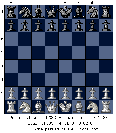 Last move : 0-1 2018 May 7 22:43:4 [Event "FICGS__CHESS__RAPID_B__000270"] [Site "FICGS"] [Date "2018.04.07"] [Round "1"] [White "Atencio,Pablo"] [Black "Liwat,Lowell"] [Result "0-1"] [WhiteElo "1700"] [BlackElo "1900"] 0-1 This chess game has been lost on time (started : 2018.04.07 16:42:56) Player Black won this chess game. Follow this game move after move (download)The tactician knows what to do when there is something to do; whereas the strategian knows what to do when there is nothing to do. (Gerald Abrahams) Ich las kürzlich ein Buch von Nietzsche. Er sagte Religion verdumme nur die Menschen. Ich stimme zu. (Robert James Fischer) Cuando tu no sabes absolutamente que mas hacer, es tiempo de entrar en pánico. (John van der Wiel) Même un GMI sait rarement calculer sur plus de cinq coups une attaque à sacrifices. (Rudolf Spielmann) I feel so... helpless. (C-3PO in Star Wars ep.3)