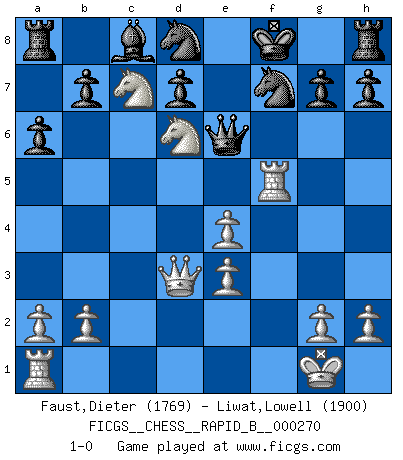 Last move : 1-0 2018 May 28 2:21:54 [Event "FICGS__CHESS__RAPID_B__000270"] [Site "FICGS"] [Date "2018.04.07"] [Round "1"] [White "Faust,Dieter"] [Black "Liwat,Lowell"] [Result "1-0"] [WhiteElo "1769"] [BlackElo "1900"] 1.d4 c5 2.e4 cxd4 3.Nf3 e5 4.c3 Nc6 5.cxd4 exd4 6.Nxd4 Qf6 7.Nb5 Bc5 8.Be3 Bxe3 9.fxe3 Qe5 10.N1c3 a6 11.Nd6+ Kf8 12.Bc4 Nh6 13.Bxf7 Nxf7 14.O-O Ncd8 15.Rf5 Qe6 16.Qd3 Ke7 17.Nd5+ Kf8 18.Nc7 1-0 Old Benoni defense Kingside Castling by player White (move 14) Player White won this chess game. Follow this game move after move (download)Bobby Fischer's current state of mind is indeed a tragedy. One of the world's greatest Chess players - the pride and sorrow of American Chess. (Frank Brady) Je älter ich werde, um so mehr schätze ich die Bauern. (Paul Keres) Aquellos que dicen que entienden al Ajedrez, no entienden nada. (Robert Hubner) Si je n'étais pas joueur d'échecs, je serais le meilleur dans quelque chose d'autre. (Anatoli Karpov) The Internet isn't free. It just has an economy that makes no sense to capitalism. (Brad Shapcott)