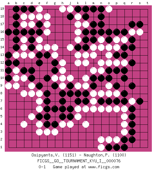 Last move : 0-1 2018 May 19 21:51:58 [Event "FICGS__GO__TOURNAMENT_KYU_I__000076"] [Site "FICGS"] [Date "2018.04.07"] [Round "1"] [Black "Osipyants,Vladimir"] [White "Naughton,Patrick"] [Result "0-1"] [Rating 1 "1151"] [Rating 2 "1100"] 1.q16 c4 2.d16 q4 3.r14 f3 4.d10 r7 5.r3 q3 6.r4 l4 7.q10 k17 8.n17 f17 9.e17 f16 10.d14 c8 11.c9 d8 12.r5 q5 13.r6 q6 14.r9 n6 15.h6 h4 16.f6 g7 17.h7 d9 18.g6 g8 19.h8 h9 20.k8 n8 21.m10 k9 22.j9 j10 23.g9 h10 24.f8 k6 25.k7 l9 26.j6 k5 27.j8 k12 28.m12 n11 29.n10 m11 30.o10 n12 31.p13 n14 32.m15 n15 33.n16 m14 34.l15 k16 35.l16 k15 36.l14 l12 37.k14 j14 38.e12 f14 39.g12 c10 40.c11 b9 41.d11 h12 42.s7 e7 43.f7 e6 44.f4 e4 45.g4 g3 46.h5 j4 47.q7 a12 48.b12 b13 49.a11 c15 50.d15 c17 51.c16 b16 52.b15 c14 53.b14 d17 54.e16 e18 55.b17 c13 56.a16 c18 57.b18 m18 58.n18 p15 59.p16 q15 60.r15 q12 61.q13 p12 62.r12 l10 63.c19 d18 64.p7 p6 65.o7 o6 66.n7 m7 67.m9 m8 68.q2 p2 69.r2 d13 70.e13 e14 71.d19 f18 72.l18 l17 73.m17 k18 74.m19 g13 75.g11 g10 76.f10 b10 77.e9 b11 78.a13 o8 79.p9 p8 80.q8 o13 81.o15 o14 82.o16 p14 83.p11 m13 84.q11 o12 85.q14 h11 86.f13 g14 87.e5 d5 88.f5 e15 89.b16 e19 90.b19 k13 91.l7 l6 92.p1 o2 93.o1 n1 94.q1 n2 95.k19 j19 96.l19 l13 97.m16 r16 98.r17 s16 99.s17 e3 100.a10 a9 101.a12 o19 102.n19 o9 103.o11 e8 104.l8 m6 105.j18 h19 106.j5 pass 0-1 Here are the names of the openings (joseki) played in the four corners : Corner d16 : d16 f17 Hoshi (Hwajeom, Seongjeom, Xingwei`) 4-4 Point. The star or hoshi (4-4) point, emphasizing influence at the potential expense of territory. Ikken Kakari (Hankan Keolch'im, Yi Gua`jiao~, 1-Space Low Approach). White 2 is the standard approach move to the 4-4. Player White won this Go (weiqi, baduk) game. Follow this game move after move (download)Six eyes in a rectangle are alive. (Anonymous) A good programmer is someone who always looks both ways before crossing a one-way street. (Doug Linder)