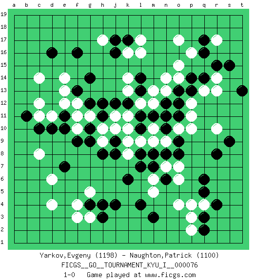 Last move : 1-0 2018 May 17 19:12:56 [Event "FICGS__GO__TOURNAMENT_KYU_I__000076"] [Site "FICGS"] [Date "2018.04.07"] [Round "1"] [Black "Yarkov,Evgeny"] [White "Naughton,Patrick"] [Result "1-0"] [Rating 1 "1198"] [Rating 2 "1100"] 1.q16 d4 2.d16 q4 3.q6 o4 4.r4 c14 5.c10 e14 6.f16 h17 7.g14 l16 8.k17 k16 9.j17 l17 10.j16 o17 11.j4 g3 12.f13 e13 13.q3 p3 14.q2 p2 15.g4 f4 16.h3 g5 17.m3 m5 18.h4 f3 19.q5 p4 20.l4 r14 21.k6 c8 22.e10 d11 23.d10 f12 24.g12 f11 25.e11 e12 26.r15 r10 27.g9 g11 28.h11 h10 29.j12 j11 30.h12 k11 31.g10 f10 32.f9 c11 33.e7 d6 34.q14 r13 35.k12 h9 36.h8 k9 37.l11 k10 38.b11 c12 39.r8 m9 40.m7 n7 41.n6 o6 42.n8 o7 43.o8 m6 44.l7 l12 45.l13 m12 46.m11 m13 47.n10 n9 48.o9 o10 49.n12 n13 50.o11 p10 51.o13 o14 52.p13 p11 53.s15 r17 54.q17 q13 55.p14 o15 56.m8 m10 57.n11 p16 58.j9 j10 59.j8 k8 60.l10 l9 61.o12 p12 62.l8 k13 63.l14 n14 64.t13 k14 65.s9 1-0 Here are the names of the openings (joseki) played in the four corners : Corner q4 : q4 q6 Hoshi (Hwajeom, Seongjeom, Xingwei`) 4-4 Point. The star or hoshi (4-4) point, emphasizing influence at the potential expense of territory. Ikken Takagakari (Hankan Nop'dakeolch'im, Yi Gaojia, 1-Space High Approach). White typically responds at 6-4 or 3-10. White 4-10 is played when White finds play on the right side advantageous. White 4-8 or 3-8 may be played when White has support at top. Corner d16 : d16 c14 Hoshi (Hwajeom, Seongjeom, Xingwei`) 4-4 Point. The star or hoshi (4-4) point, emphasizing influence at the potential expense of territory. Ikken Kakari (Hankan Keolch'im, Yi Gua`jiao~, 1-Space Low Approach). White 2 is the standard approach move to the 4-4. Corner q16 : q16 l16 Hoshi (Hwajeom, Seongjeom, Xingwei`) 4-4 Point. The star or hoshi (4-4) point, emphasizing influence at the potential expense of territory. Corner d4 : d4 j4 Hoshi (Hwajeom, Seongjeom, Xingwei`) 4-4 Point. The star or hoshi (4-4) point, emphasizing influence at the potential expense of territory. Player Black won this Go (weiqi, baduk) game. Follow this game move after move (download)The saki bottle shape is negative. (Anonymous) Without deviation from the norm, progress is not possible. (Frank Zappa)