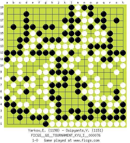 Last move : 1-0 2018 May 1 7:14:9 [Event "FICGS__GO__TOURNAMENT_KYU_I__000076"] [Site "FICGS"] [Date "2018.04.07"] [Round "1"] [Black "Yarkov,Evgeny"] [White "Osipyants,Vladimir"] [Result "1-0"] [Rating 1 "1198"] [Rating 2 "1151"] 1.q16 d4 2.d16 r4 3.c13 k16 4.c3 c4 5.d3 e3 6.e2 f3 7.f2 g3 8.b4 b5 9.b3 e5 10.p3 r7 11.m3 c10 12.h16 n17 13.d8 c8 14.c7 b7 15.b8 c9 16.b6 c6 17.a7 d7 18.d6 b7 19.k17 a6 20.l16 n15 21.r2 q14 22.r14 q15 23.r15 p16 24.q17 q10 25.q13 p14 26.p13 o14 27.r11 r10 28.s10 s9 29.j3 h8 30.q11 s11 31.s12 t10 32.p17 o17 33.o16 p15 34.l18 n12 35.o13 n13 36.m14 n14 37.l12 m11 38.k9 h10 39.h12 e11 40.j10 h11 41.j11 o10 42.h9 g9 43.m15 m16 44.m17 n16 45.g12 e13 46.e12 d12 47.f12 d13 48.c14 l15 49.l17 m13 50.j9 g10 51.l14 l13 52.k15 k14 53.l15 k12 54.g8 g7 55.f8 f9 56.k7 e8 57.f7 f6 58.h7 e7 59.h6 j12 60.d17 e15 61.j14 h13 62.h14 g13 63.f13 j13 64.g14 k13 65.m8 o6 66.n5 n6 67.m6 o5 68.o4 f14 69.f15 e14 70.n7 o7 71.o8 p8 72.g2 h3 73.p5 p7 74.j4 h2 75.e16 l1 76.s3 s4 77.t4 t5 78.t3 r3 79.s2 q5 80.q3 p6 81.s5 p4 82.o3 t6 83.b12 b11 84.s6 t7 85.o18 n18 86.q18 n1 87.j2 j1 88.g1 h1 89.k2 k1 90.q4 r5 91.d15 l10 92.t12 p11 93.c12 c11 94.d14 d11 95.n19 m19 96.o19 m18 97.l19 p1 98.q2 j8 99.k8 h4 100.j5 g6 101.j7 g8 102.a11 a10 103.a12 o9 104.k11 n8 105.m7 m9 106.h5 g5 107.g16 l11 108.m2 m1 109.n2 q1 110.o2 o1 111.a4 q12 112.r12 p12 113.o12 o11 114.r13 l2 115.l3 r1 116.s17 s1 117.a5 a8 118.d18 t11 119.l9 p5 120.c2 t1 121.t2 k10 122.b16 1-0 Here are the names of the openings (joseki) played in the four corners : Corner d4 : d4 c3 Hoshi (Hwajeom, Seongjeom, Xingwei`) 4-4 Point. The star or hoshi (4-4) point, emphasizing influence at the potential expense of territory. Corner q4 : r4 p3 Komoku (Somok, Xiao~mu`) 3-4 Point. The komoku (3-4) point is the traditional corner enclosure move.. Ikken Kakari (Hankan Keolch'im, Yi Gua`jiao~, 1-Space Low Pincer). The small knight move is the basic approach move to the 3-4 point stone. It has been continually used for over four centuries. There are limitless variations, with new moves constantly being discovered. Black 2 opens the door to a treaure store of joseki. Corner q16 : q16 n17 Hoshi (Hwajeom, Seongjeom, Xingwei`) 4-4 Point. The star or hoshi (4-4) point, emphasizing influence at the potential expense of territory. Niken Kakari (Dukan Keolch'im, E`r Gua`jiao~, 2-Space Low Approach). Black typically answers by 7-3 or 3-5 (which is not joseki). Player Black won this Go (weiqi, baduk) game. Follow this game move after move (download)White is always trying to kill a bigger group than black is trying to save. (Anonymous) Quotation,n.: The act of repeating erroneously the words of another. The words erroneously repeated. (Ambrose Bierce, The Devil's Dictionary)