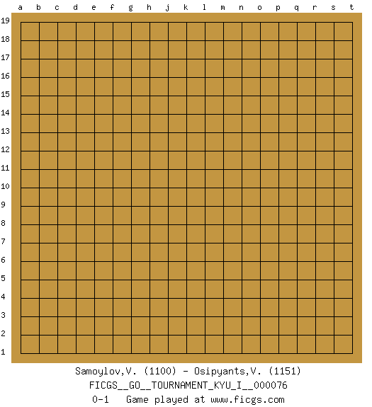Last move : 0-1 2018 May 7 22:43:4 [Event "FICGS__GO__TOURNAMENT_KYU_I__000076"] [Site "FICGS"] [Date "2018.04.07"] [Round "1"] [Black "Samoylov,Vladimir"] [White "Osipyants,Vladimir"] [Result "0-1"] [Rating 1 "1100"] [Rating 2 "1151"] 0-1 This go game has been lost on time (started : 2018.04.07 16:44:24) Here are the names of the openings (joseki) played in the four corners : Player White won this Go (weiqi, baduk) game. Follow this game move after move (download)If you have won four corners, resign. (Anonymous) Political correctness is subjecting us to gross incompetence. (Johann Piek)