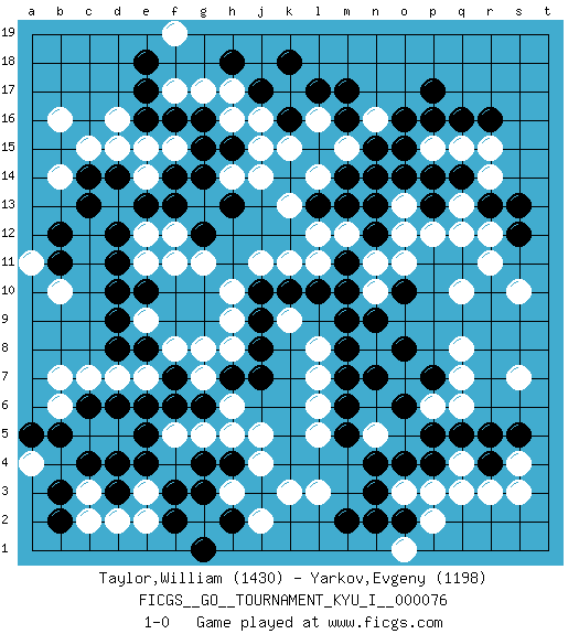 Last move : 1-0 2018 November 26 16:0:34 [Event "FICGS__GO__TOURNAMENT_KYU_I__000076"] [Site "FICGS"] [Date "2018.04.07"] [Round "1"] [Black "Taylor,William"] [White "Yarkov,Evgeny"] [Result "1-0"] [Rating 1 "1430"] [Rating 2 "1198"] 1.r16 d16 2.c4 q3 3.p17 e3 4.r5 q8 5.d6 h3 6.c14 e14 7.d12 f12 8.d10 g17 9.p4 p3 10.o4 o3 11.n4 r12 12.n3 s4 13.d3 d2 14.e4 l3 15.f3 e2 16.f2 g2 17.g3 j2 18.g1 l5 19.r4 r3 20.s5 s3 21.p7 q7 22.o8 q4 23.q5 s7 24.o2 p2 25.h4 j4 26.h2 p6 27.o6 q6 28.p5 l7 29.o10 q10 30.m9 k9 31.r13 q13 32.s12 r14 33.s13 r11 34.q14 q15 35.p14 r15 36.p13 q12 37.q16 p15 38.o15 p12 39.p16 o12 40.n13 l11 41.l10 k11 42.m11 m12 43.n12 n11 44.m10 n14 45.m13 o13 46.o14 l12 47.l13 k13 48.n15 l14 49.m14 m15 50.n14 o11 51.k10 j11 52.j10 h10 53.j9 h9 54.j8 h5 55.j3 h8 56.j7 j5 57.h7 g7 58.g6 g5 59.f6 k3 60.m2 o1 61.n2 h3 62.g4 f5 63.e5 h6 64.f7 g8 65.m6 l6 66.m7 n5 67.m5 l8 68.m8 l16 69.k14 k15 70.l15 j14 71.m16 n10 72.n9 f8 73.d8 e7 74.e6 c3 75.d4 d7 76.e8 e9 77.d9 c7 78.c6 e11 79.d11 d13 80.c13 l14 81.l17 m15 82.m17 n16 83.l15 o7 84.n7 m15 85.o16 c15 86.d14 k17 87.k18 s10 88.j17 b7 89.b3 c2 90.b2 b10 91.b11 a11 92.b12 b6 93.b5 b14 94.e13 a4 95.a5 e12 96.f13 g13 97.f14 e15 98.g14 h14 99.g12 g11 100.h13 j16 101.k16 h16 102.e10 f11 103.f16 f17 104.e16 d15 105.e17 f15 106.g15 b16 107.g16 f19 108.e18 h17 109.h15 j15 110.h18 1-0 Here are the names of the openings (joseki) played in the four corners : Corner d4 : c4 e3 Komoku (Somok, Xiao~mu`) 3-4 Point. The komoku (3-4) point is the traditional corner enclosure move.. Ikken Kakari (Hankan Keolch'im, Yi Gua`jiao~, 1-Space Low Pincer). The small knight move is the basic approach move to the 3-4 point stone. It has been continually used for over four centuries. There are limitless variations, with new moves constantly being discovered. White 2 opens the door to a treaure store of joseki. Corner q4 : q3 r5 Komoku (Somok, Xiao~mu`) 3-4 Point. The komoku (3-4) point is the traditional corner enclosure move.. Ikken Kakari (Hankan Keolch'im, Yi Gua`jiao~, 1-Space Low Pincer). The small knight move is the basic approach move to the 3-4 point stone. It has been continually used for over four centuries. There are limitless variations, with new moves constantly being discovered. Black 2 opens the door to a treaure store of joseki. Corner d16 : d16 c14 Hoshi (Hwajeom, Seongjeom, Xingwei`) 4-4 Point. The star or hoshi (4-4) point, emphasizing influence at the potential expense of territory. Ikken Kakari (Hankan Keolch'im, Yi Gua`jiao~, 1-Space Low Approach). Black 2 is the standard approach move to the 4-4. Player Black won this Go (weiqi, baduk) game. Follow this game move after move (download)The comb formation is alive. (Anonymous) 98% of all statistics are made up. (Author unknown)
