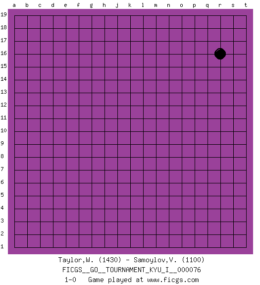Last move : 1-0 2018 May 8 22:53:3 [Event "FICGS__GO__TOURNAMENT_KYU_I__000076"] [Site "FICGS"] [Date "2018.04.07"] [Round "1"] [Black "Taylor,William"] [White "Samoylov,Vladimir"] [Result "1-0"] [Rating 1 "1430"] [Rating 2 "1100"] 1.r16 1-0 This go game has been lost on time (started : 2018.04.07 16:44:24) Here are the names of the openings (joseki) played in the four corners : Player Black won this Go (weiqi, baduk) game. Follow this game move after move (download)If you lose by one point, take a rest. (Anonymous) Good decisions come from experience, and experience comes from bad decisions. (Anonymous)