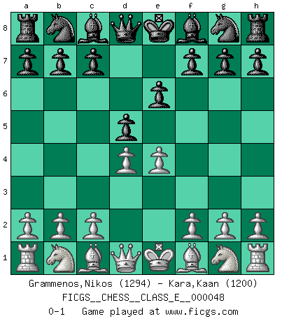Last move : 0-1 2007 June 19 2:4:52 [Event "FICGS__CHESS__CLASS_E__000048"] [Site "FICGS"] [Date "2007.05.02"] [Round "1"] [White "Grammenos,Nikos"] [Black "Kara,Kaan"] [Result "0-1"] [WhiteElo "1294"] [BlackElo "1200"] 1.e4 e6 2.d4 d5 0-1 This chess game has been lost on time (started : 2007.05.02 2:35:50) French defense Player Black won this chess game. Follow this game move after move (download)Your body has to be in top condition. Your Chess deteriorates as your body does. You can't separate body from mind. (Bobby Fischer) In der Schule lernt man nichts. Es ist nur Zeitverschwendung. (Robert James Fischer) Nos gusta pensar. (Gary Kasparov) Les Cavaliers se révèlent fort utiles dans les positions fermées. D'habitude, les Fous sont un peu plus forts que les Cavaliers dans les positions ouvertes. Qu'on le veuille ou non, il restera toujours des exceptions ! A good book on your shelf is a friend that turns its back on you and remains a friend. (Author unknown)