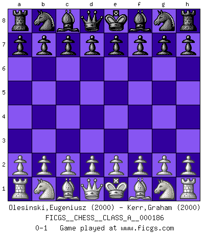 Last move : 0-1 2018 May 18 23:34:33 [Event "FICGS__CHESS__CLASS_A__000186"] [Site "FICGS"] [Date "2018.04.08"] [Round "1"] [White "Olesinski,Eugeniusz"] [Black "Kerr,Graham"] [Result "0-1"] [WhiteElo "2000"] [BlackElo "2000"] 0-1 This chess game has been lost on time (started : 2018.04.08 14:49:9) Player Black won this chess game. Follow this game move after move (download)No other master has such a terrific will to win. At the board he radiates danger, and even the strongest opponents tend to freeze, like rabbits when they smell a panther. Even his weaknesses are dangerous. As white, his opening game is predictable - you can make plans against it - but so strong that your plans almost never work. In the middle game his precision and invention are fabulous, and in the end game you simply cannot beat him. (Anonymous German Expert) Es genügt nicht ein guter Spieler zu sein, man muß auch gut spielen. (Siegbert Tarrasch) Un buen sacrificio es aquel que aunque no sea necesariamente sólido, deja a tu oponente aturdido y confuso. (Rudolph Spielmann) Même si vous avez un bon coup à faire, regardez toujours s'il n'y en a pas un qui lui soit préférable. (Pedro Damiano) Warrior pose battles inner weakness and wins focus. You see that there is no war within you. You're on your own side, and you are your own strength. (Terri Guillemets)