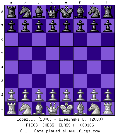 Last move : 0-1 2018 May 18 23:34:33 [Event "FICGS__CHESS__CLASS_A__000186"] [Site "FICGS"] [Date "2018.04.08"] [Round "1"] [White "Lopez,Charly"] [Black "Olesinski,Eugeniusz"] [Result "0-1"] [WhiteElo "2000"] [BlackElo "2000"] 0-1 This chess game has been lost on time (started : 2018.04.08 14:49:9) Player Black won this chess game. Follow this game move after move (download)We like to think. (Gary Kasparov) Wer nie einen Fehler gemacht hat, hat nie etwas Neues ausprobiert. (Albert Einstein) El Ajedrez es un mar en el cual un mosquito puede beber y un elefante puede bañarse. (Refrán Hindú) C'est une question de caractère, Beaucoup de gens perdent leur motivation très vite. D'autres, ils sont rares, peuvent la conserver très longtemps. J'aime les échecs, encore aujourd'hui je suis heureux d'analyser des parties. J'aime toujours gagner, je déteste encore perdre. Bien jouer est important pour mon intégrité intellectuelle et morale. Et puis les échecs vivent en ce moment une période historique grâce à Internet. Ils se développent dans les systèmes éducatifs à travers le monde. Ils sortent de leur ghetto, et c'est mon rôle de mener à bien cette révolution. (Gary Kasparov) The greatest con, that he ever pulled... was making you believe... that he is you. (Revolver, movie)
