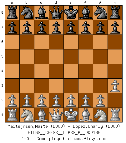 Last move : 1-0 2018 June 9 1:45:19 [Event "FICGS__CHESS__CLASS_A__000186"] [Site "FICGS"] [Date "2018.04.08"] [Round "1"] [White "Maitejrsen,Maite"] [Black "Lopez,Charly"] [Result "1-0"] [WhiteElo "2000"] [BlackElo "2000"] 1.h3 1-0 This chess game has been lost on time (started : 2018.04.08 14:49:9) Clemenz (Mead's, Basman's or de Klerk's) Opening Player White won this chess game. Follow this game move after move (download)Chess is no whit inferior to the violin, and we have a large number of professional violinists. (Mikhail Botvinnik) Gewöhnliche Menschen denken nur daran, wie sie ihre Zeit verbringen. Ein intelligenter Mensch versucht, sie auszunutzen. (Arthur Schopenhauer) En el Ajedrez, tal como es jugado por los Maestros, practicamente la suerte es eliminada. (Emanuel Lasker) Celui qui prend des risques peut perdre, celui qui n'en prend pas perd toujours. (Xavier Tartacover) Somewhere in the world there is an epigram for every dilemma. (Hendrik Willem van Loon)