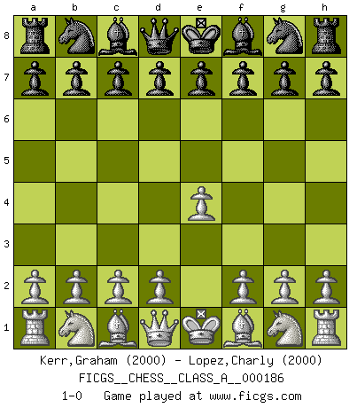 Last move : 1-0 2018 May 18 23:34:33 [Event "FICGS__CHESS__CLASS_A__000186"] [Site "FICGS"] [Date "2018.04.08"] [Round "1"] [White "Kerr,Graham"] [Black "Lopez,Charly"] [Result "1-0"] [WhiteElo "2000"] [BlackElo "2000"] 1.e4 1-0 This chess game has been lost on time (started : 2018.04.08 14:49:9) King's pawn Opening Player White won this chess game. Follow this game move after move (download)When in doubt... play Chess ! (Tevis) Fallen sollten polizeilich verboten werden. (Savielly Grigorievitsch Tartakower) El Ajedrez es un mar en el cual un mosquito puede beber y un elefante puede bañarse. (Refrán Hindú) On croit qu'il y a plus de mauvais joueurs que de bons joueurs, c'est faux : Il y a autant de joueurs qui gagnent que de joueurs qui perdent. (Philippe Geluck) Perhaps chess is the wrong game for the times (The Chess Master and the Computer, by Garry Kasparov - 2010)