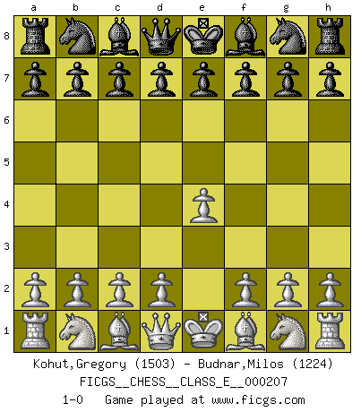 Last move : 1-0 2018 April 16 13:0:34 [Event "FICGS__CHESS__CLASS_E__000207"] [Site "FICGS"] [Date "2018.04.09"] [Round "1"] [White "Kohut,Gregory"] [Black "Budnar,Milos"] [Result "1-0"] [WhiteElo "1503"] [BlackElo "1224"] 1.e4 1-0 King's pawn Opening Player White won this chess game. Follow this game move after move (download)I thought the most common mistake [in chess] was the first one: Learning the game :P (Garvin Gray, FICGS forum) Als er Schachweltmeister wurde ließ er praktisch alle stärksten Sovietspieler für sich arbeiten. Wenn ein auch nur mittelmässiger Meister ein Spezialist für eine bestimmte Eröffnung war, wurde er von Karpov gerufen. Das wurde alles geheim gehalten. (Mikhail Moiseyevich Botvinik) Cuando me preguntan: -¿Cual es el secreto que te hace hacer mejores movidas que tus oponentes?, Yo respondo: Me da gusto que me pregunten eso, porque, como veran, hay una simple razón. Yo pienso mis propias movidas y dejo a mi oponente que el piense las suyas. (Alexander Alekhine) J'ai vu le vaincu d'Echecs jouer des années durant dans l'espoir de la fête de la victoire. Car tu es plus riche de ce qu'elle existe si même elle n'est point pour toi. Ainsi de la perle du fond des mers. (Antoine de Saint-Exupéry) If I had no sense of humor, I would long ago have committed suicide. (Mahatma Gandhi)