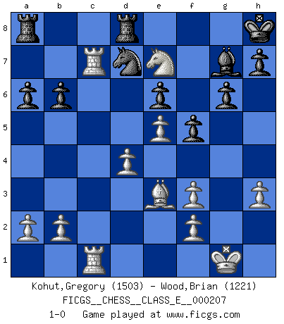 Last move : 1-0 2018 July 9 3:14:34 [Event "FICGS__CHESS__CLASS_E__000207"] [Site "FICGS"] [Date "2018.04.09"] [Round "1"] [White "Kohut,Gregory"] [Black "Wood,Brian"] [Result "1-0"] [WhiteElo "1503"] [BlackElo "1221"] 1.d4 d5 2.c4 e6 3.Nf3 Nf6 4.Nc3 c6 5.e3 Nbd7 6.Qc2 g6 7.Bd3 dxc4 8.Bxc4 Bg7 9.O-O O-O 10.e4 Qc7 11.h3 b6 12.Be3 Bb7 13.Rac1 a6 14.e5 Nd5 15.Bxd5 cxd5 16.Nxd5 Qxc2 17.Ne7+ Kh8 18.Rxc2 Bxf3 19.gxf3 f5 20.Rc7 Rfd8 21.Rfc1 1-0 Queen's gambit declined Kingside Castling by player White (move 9) Kingside Castling by player Black (move 9) Player White won this chess game. Follow this game move after move (download)A strong memory, concentration, imagination, and a strong will is required to become a great Chess player. (Bobby Fischer) Früher wurde jeder komplizierte Zug, jedes interessante Opfer mit großem Beifall und Enthusiasmus aufgenommen. Heute schaltet man einfach seinen Fritz an, und man kann sehen, was los ist, ob der Zug geht oder nicht. (Vladimir Kramnik) El muchacho (en ese entonces un niño de 12 años llamado Anatoly Karpov) no tiene ni idea de lo que es el Ajedrez y no hay futuro en absoluto para el en esta profesión. (Mikhail Botvinnik) Les erreurs sont comme les malheurs, elles n'arrivent jamais seules. (Siegbert Tarrasch) When you don't know what to do, walk fast and look worried. (Anonymous)