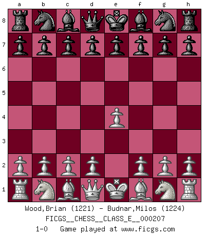 Last move : 1-0 2018 April 13 17:54:52 [Event "FICGS__CHESS__CLASS_E__000207"] [Site "FICGS"] [Date "2018.04.09"] [Round "1"] [White "Wood,Brian"] [Black "Budnar,Milos"] [Result "1-0"] [WhiteElo "1221"] [BlackElo "1224"] 1.e4 1-0 King's pawn Opening Player White won this chess game. Follow this game move after move (download)What is the difference between chess and football? Everybody understands football, but nobody plays it. Everybody plays chess, but nobody understands it. Everything is relative. (Vladimir Kramnik) Versuche, dich von der Sklaverei der Eröffnungsvarianten zu befreien. Stattdessen soll man gewisse Typenpositionen erlernen, die man eingehend analysiert. (Aaron Nimzowitsch) Yo jugué Ajedrez con el y a veces le pude haber ganado solo que siempre devuelve su última jugada y juega la partida de manera diferente. (Mark Twain) Avant la finale, les dieux ont créé le milieu de partie. (Tarrasch) You lose, general Kenobi. (General Grievous in Star Wars ep.3)