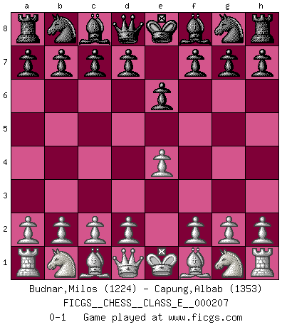 Last move : 0-1 2018 April 14 7:34:59 [Event "FICGS__CHESS__CLASS_E__000207"] [Site "FICGS"] [Date "2018.04.09"] [Round "1"] [White "Budnar,Milos"] [Black "Capung,Albab"] [Result "0-1"] [WhiteElo "1224"] [BlackElo "1353"] 1.e4 e6 0-1 French defense Player Black won this chess game. Follow this game move after move (download)Human affairs are like a Chess game: only those who do not take it seriously can be called good players. (Hung Tzu Ch'eng) Es hat in meinem Leben Zeiten gegeben, in denen das Schachspiel, wenn nicht zum Lebenszweck, so doch zu einem regelrechten Lebensersatz geworden ist. Man fühlt sich in solchen Zeiten nicht so, als besäße man eine göttliche Gabe, sondern eher so, als sei man von ihr besessen. (Garry Kasparov) Una compensación adecuada por un sacrificio es tener una combinación sólida que conduce a una posición ganadora; una compensación adecuada por una metida de pata es dejar a tu oponente arrebatar una derrota de las fauces de la victoria. (Bruce A. Moon) Le profane ne songe pas à la somme de jouissance dont il se prive, qui méconnaît ce jeu aux ressources aussi variées que passionnantes. (Jean-Marie Jeanton-Lamarche) No, I am still playing. (Anatoly Karpov)
