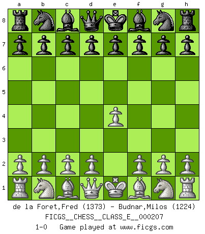 Last move : 1-0 2018 April 13 17:55:12 [Event "FICGS__CHESS__CLASS_E__000207"] [Site "FICGS"] [Date "2018.04.09"] [Round "1"] [White "de la Foret,Fred"] [Black "Budnar,Milos"] [Result "1-0"] [WhiteElo "1373"] [BlackElo "1224"] 1.e4 1-0 King's pawn Opening Player White won this chess game. Follow this game move after move (download)The enormous mental resilience, without which no Chess player can exist, was so much taken up by Chess that he could never free his mind of this game. (Albert Einstein) Bis zum Jahr 1971 verlief in meiner Schachkariere alles glatt. Dieses dramatische Match [Fischer-Taimanov 6:0] machte mein Leben zur Hölle. (Mark Taimanov) Evita las multitudes. Haz independientemente tu propio razonamiento. Trata de ser el jugador de Ajedrez, no la pieza de Ajedrez. (Ralph Charell) Celui qui prend des risques peut perdre, celui qui n'en prend pas perd toujours. (Xavier Tartacover) A good programmer is someone who always looks both ways before crossing a one-way street. (Doug Linder)