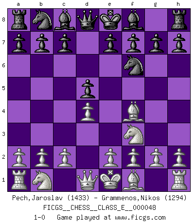 Last move : 1-0 2007 June 12 19:10:29 [Event "FICGS__CHESS__CLASS_E__000048"] [Site "FICGS"] [Date "2007.05.02"] [Round "1"] [White "Pech,Jaroslav"] [Black "Grammenos,Nikos"] [Result "1-0"] [WhiteElo "1433"] [BlackElo "1294"] 1.d4 d5 2.Nf3 Nf6 3.Bf4 1-0 This chess game has been lost on time (started : 2007.05.02 2:35:50) Queen's Bishop game Player White won this chess game. Follow this game move after move (download)When in doubt... play Chess ! (Tevis) Gewinnen beim Schach fördert das Selbstvertrauen. Beim Sex spüre ich sowas nicht... (Garry Kasparov) El Ajedrez, como cualquier otra actividad creativa, puede existir solo a través de méritos combinados de aquellos que tienen talento creativo y de aquellos que tienen la habilidad de organizar un trabajo creativo. (Mikhail Botvinnik) La vérité est comme le meilleur coup aux échecs : elle existe, mais il faut la chercher. (Arturo Perez-Reverte) Nothing is more important for teaching us to understand the concepts we have than constructing fictitious ones. (Ludwig Wittgenstein)