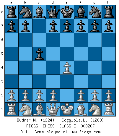 Last move : 0-1 2018 April 14 7:35:13 [Event "FICGS__CHESS__CLASS_E__000207"] [Site "FICGS"] [Date "2018.04.09"] [Round "1"] [White "Budnar,Milos"] [Black "Coggiola,Leandro Damian"] [Result "0-1"] [WhiteElo "1224"] [BlackElo "1268"] 1.e4 c5 0-1 Sicilian defense Player Black won this chess game. Follow this game move after move (download)In blitz, the Knight is stronger than the Bishop. (Vlastimil Hort) Ich glaube nicht an Psychologie, ich glaube an gute Züge. (Robert James Fischer) Cuando no sepas que mover, espera por una idea que se le venga a la la cabeza de tu oponente. Tenlo por seguro de que esa idea estará incorrecta. (Siegbert Tarrasch) La solitude du joueur d'Echecs à l'approche du mat est semblable à celle du condamné. (Francis Szpiner) Creativity is allowing yourself to make mistakes. Art is knowing which ones to keep. (Scott Adams)