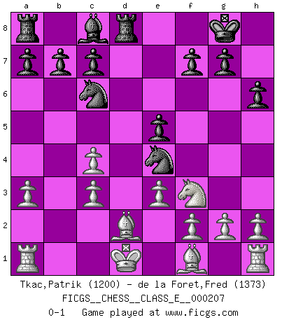 Last move : 0-1 2018 July 29 8:40:13 [Event "FICGS__CHESS__CLASS_E__000207"] [Site "FICGS"] [Date "2018.04.09"] [Round "1"] [White "Tkac,Patrik"] [Black "de la Foret,Fred"] [Result "0-1"] [WhiteElo "1200"] [BlackElo "1373"] 1.c4 e5 2.d3 Nf6 3.Nf3 Nc6 4.Nc3 Bb4 5.e3 O-O 6.Ng5 d5 7.a3 Bxc3+ 8.bxc3 dxc4 9.dxc4 Qxd1+ 10.Kxd1 Rd8+ 11.Bd2 h6 12.Nf3 Ne4 0-1 This chess game has been lost on time (started : 2018.04.09 1:7:21) English Opening Kingside Castling by player Black (move 5) Player Black won this chess game. Follow this game move after move (download)One bad move nullifies forty good ones. (Horowitz) Wenn du nicht weißt was du tun sollst, warte bis dein Gegner eine Idee hat. Sie wird sicher schlecht sein. (Siegbert Tarrasch) El Ajedrez tiene tanto misterio como las mujeres. (Purdy) Les échecs, c'est la lutte contre l'erreur. (Johannes Zukertort) Every man's memory is his private literature. (Aldous Huxley)