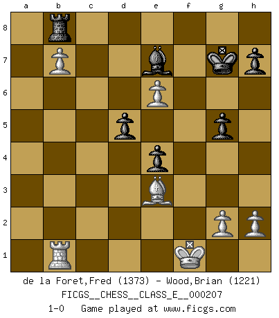 Last move : 1-0 2018 May 10 6:37:26 [Event "FICGS__CHESS__CLASS_E__000207"] [Site "FICGS"] [Date "2018.04.09"] [Round "1"] [White "de la Foret,Fred"] [Black "Wood,Brian"] [Result "1-0"] [WhiteElo "1373"] [BlackElo "1221"] 1.e4 c5 2.Nf3 d6 3.d4 cxd4 4.Nxd4 Nc6 5.Bc4 Nf6 6.Nc3 e6 7.O-O Be7 8.Be3 O-O 9.Qe2 Bd7 10.Bb3 Nxd4 11.Bxd4 Bc6 12.Rad1 Qa5 13.f4 e5 14.Be3 Nxe4 15.Nxe4 Bxe4 16.fxe5 Rad8 17.e6 f5 18.Qd2 Qc7 19.Bd5 Bxd5 20.Qxd5 Qxc2 21.Qxb7 Qe4 22.Qxe4 fxe4 23.b4 Rxf1+ 24.Kxf1 a6 25.a4 d5 26.b5 axb5 27.axb5 g5 28.b6 Kg7 29.b7 Rb8 30.Rb1 1-0 Sicilian Kingside Castling by player White (move 7) Kingside Castling by player Black (move 8) Player White won this chess game. Follow this game move after move (download)Chess is above all, a fight ! (Emanuel Lasker) Ich habe die besten Aussichten, den ersten Preis zu gewinnen - denn jeder muss gegen Steinitz spielen, nur ich nicht! (Wilhelm Steinitz) No soy una persona materialista y por eso, no resiento la falta o pérdida del dinero. La ausencia de cosas mundanas carece de importancia. Ya que el Ajedrez es una forma en la que puedo ser tan materialista como yo desee sin tener la necesidad de vender mi alma. (Jamie Walter Adams) Votre prénom est 'Tactique', votre deuxième prénom est 'Tactique' et votre nom est 'Tactique'. (Ken Smith) Internet: Absolute communication, absolute isolation. (Paul Carvel)