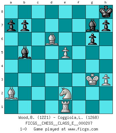 Last move : 1-0 2018 April 22 0:33:24 [Event "FICGS__CHESS__CLASS_E__000207"] [Site "FICGS"] [Date "2018.04.09"] [Round "1"] [White "Wood,Brian"] [Black "Coggiola,Leandro Damian"] [Result "1-0"] [WhiteElo "1221"] [BlackElo "1268"] 1.e4 c5 2.Nc3 d6 3.g3 Nc6 4.Bg2 Nf6 5.d3 g6 6.Nge2 Bg7 7.O-O O-O 8.h3 e5 9.Nd5 Bd7 10.Nxf6+ Bxf6 11.c3 Qc8 12.Kh2 Bg7 13.Be3 f5 14.f4 fxe4 15.dxe4 Qc7 16.b4 cxb4 17.cxb4 Nxb4 18.Qb3+ Kh8 19.Qxb4 Qc2 20.Qd2 Rac8 21.Rad1 Bb5 22.Rfe1 Rf7 23.Qxc2 Rxc2 24.Rd2 Rfc7 25.Bf3 Rxd2 26.Bxd2 Rc2 27.Bb4 exf4 28.Bxd6 fxg3+ 29.Kxg3 Rxa2 30.e5 Kg8 31.Bd5+ Kh8 32.Bxa2 1-0 Sicilian : Closed Kingside Castling by player White (move 7) Kingside Castling by player Black (move 7) Player White won this chess game. Follow this game move after move (download)The Pawns are the soul of the game. (Francois Andre Danican Philidor) Sicherlich können nur Meister einen Stil haben. Daß ein nicht-Meister auch nur ein einziges Mal in seinem Leben eine Partie folgerecht durchführte, habe ich niemals bemerkt. (Emanuel Lasker) El muchacho (en ese entonces un niño de 12 años llamado Anatoly Karpov) no tiene ni idea de lo que es el Ajedrez y no hay futuro en absoluto para el en esta profesión. (Mikhail Botvinnik) Il n'y a plus de joueurs du niveau de Jacob Murray dont la seule quête est le beau jeu, le plaisir de voir les pièces construire quelque chose. Sur 10 idées à la minute, 9 seront sans intérêt, la dernière s'avèrera géniale. (Christian Bauer) Any activity becomes creative when the doer cares about doing it right or doing it better. (John Updike)