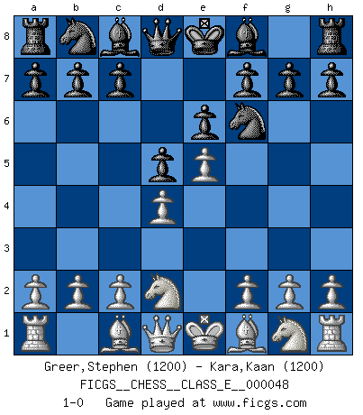 Last move : 1-0 2007 June 14 7:29:39 [Event "FICGS__CHESS__CLASS_E__000048"] [Site "FICGS"] [Date "2007.05.02"] [Round "1"] [White "Greer,Stephen"] [Black "Kara,Kaan"] [Result "1-0"] [WhiteElo "1200"] [BlackElo "1200"] 1.e4 e6 2.d4 d5 3.Nd2 Nf6 4.e5 1-0 This chess game has been lost on time (started : 2007.05.02 2:35:50) French : Tarrasch, Closed variation Player White won this chess game. Follow this game move after move (download)By the beauty of his games, the clarity of his play, and the brilliance of his ideas, Fischer made himself an artist of the same stature as Brahms, Rembrandt, and Shakespeare. (David Levy) Die Idee von Capablanca, Schach als Fach in den Schulen zu lehren, ist großartig. (Fidel Castro) En la perfecta combinación de Ajedrez como en una historia corta de primera clase, toda la trama y contra trama deberá conducir hacia un final sorprendente, el interes no es mitigado hasta el último momento. (Yates and Winter) Il vaut mieux sacrifier les pièces de l'adversaire. (Xavier Tartacover) Think like a man of action, act like a man of thought. (Henri Louis Bergson)