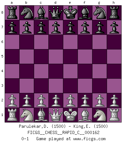 Last move : 0-1 2018 May 9 10:53:59 [Event "FICGS__CHESS__RAPID_C__000162"] [Site "FICGS"] [Date "2018.04.09"] [Round "1"] [White "Parulekar,Devadatta"] [Black "King,Esmaeil"] [Result "0-1"] [WhiteElo "1500"] [BlackElo "1500"] 0-1 This chess game has been lost on time (started : 2018.04.09 3:20:38) Player Black won this chess game. Follow this game move after move (download)Chess is a cold bath for the mind. (Sir John Simon) Wie kann ich Remis annehmen? Ich weiß ja gar nicht, wie ich stehe! (Fritz Sämisch) Sin errores no puede haber brillantez. (Emanuel Lasker) Le temps de noter son nom sur la feuille de partie, j'étais déjà en zeitnot ! D'un modeste amateur apparié lors de la première ronde d'un open contre le grand-maître Azmaïparashvili. Man is still the most extraordinary computer of all. (John F. Kennedy)
